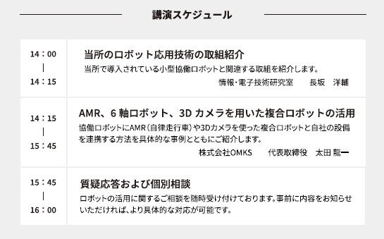 本セミナーでは、こうした複合ロボット技術の最新動向を紹介するとともに、設置スペースに制約のある現場や、中小企業の製造現場でも導入しやすい活用方法・実例について解説します。